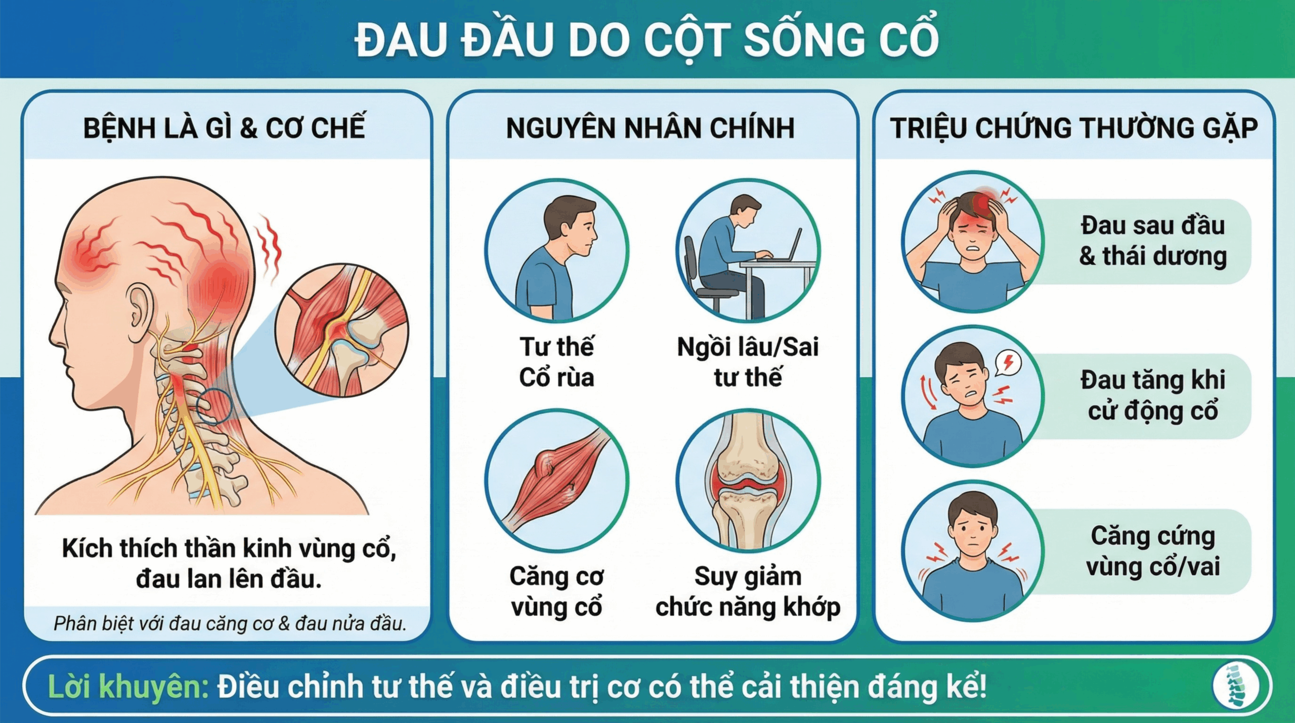 Đau đầu do cột sống cổ là dạng đau đầu xảy ra khi các vấn đề ở cơ và khớp vùng cổ gây kích thích thần kinh và đau lan lên vùng đầu. Nguyên nhân có thể bao gồm mất ổn định cột sống cổ, căng cơ cổ, tư thế cổ rùa. Cần phân biệt với đau đầu căng cơ thông thường hoặc đau nửa đầu.