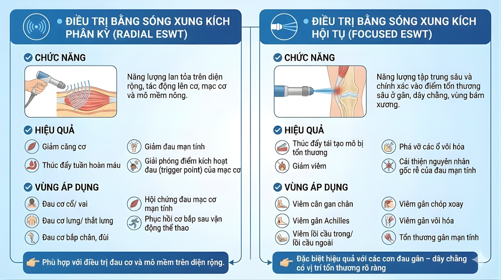 Sóng xung kích phân kỳ (Radial ESWT) truyền năng lượng lan tỏa trên diện rộng, tác động chủ yếu lên cơ, mạc cơ và các mô mềm nông.