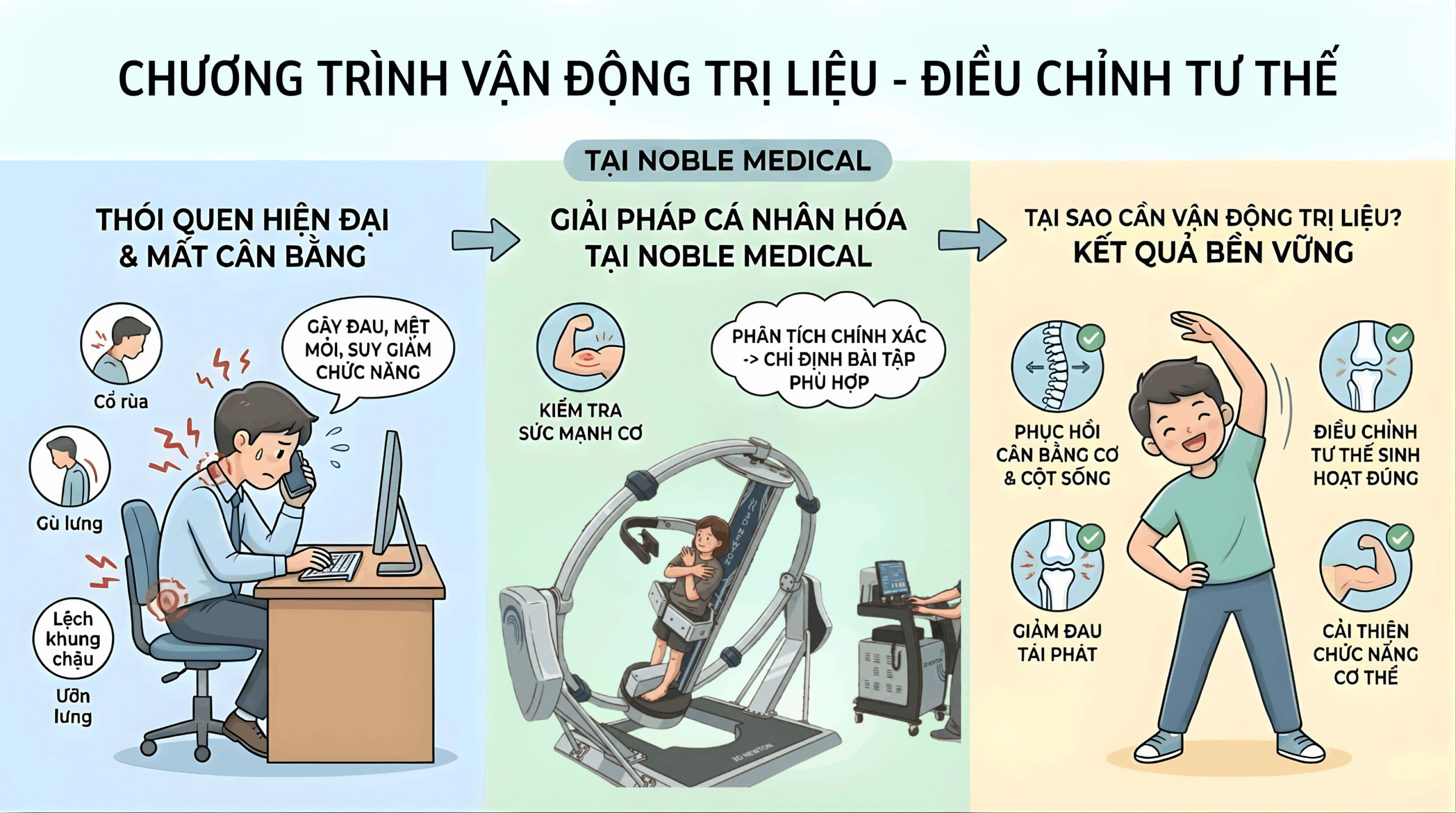 Con người ở xã hội hiện đại do ngồi lâu, sử dụng điện thoại và máy tính nhiều, thiếu vận động, rất dễ gặp các tình trạng mất cân bằng tư thế như cổ rùa, gù lưng, lệch khung chậu, ưỡn lưng quá mức hoặc duỗi cột sống thắt lưng. Mất cân bằng tư thế không chỉ là vấn đề về thẩm mỹ, mà còn có thể dẫn đến đau cổ, vai, thắt lưng, thoát vị đĩa đệm, tăng áp lực lên khớp, mệt mỏi mạn tính và suy giảm chức năng vận động. Chương trình vận động trị liệu – điều chỉnh tư thế tại Noble Medical thực hiện phân tích tư thế chính xác và đánh giá sức mạnh cơ, cân bằng cơ, từ đó chỉ định các bài tập phù hợp cho từng bệnh nhân, giúp phục hồi tư thế đúng và cải thiện chức năng cơ thể một cách bền vững.